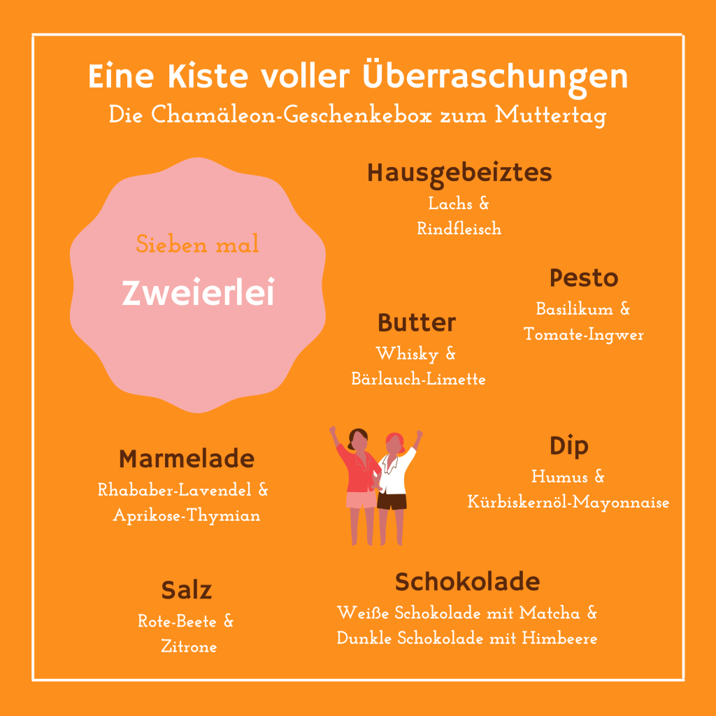 Zum Muttertag stellen wir euch eine Geschenke-Box (39€) mit vielen kleinen Leckereien zusammen: Natürlich alles selbst kreiert und handgefertigt.